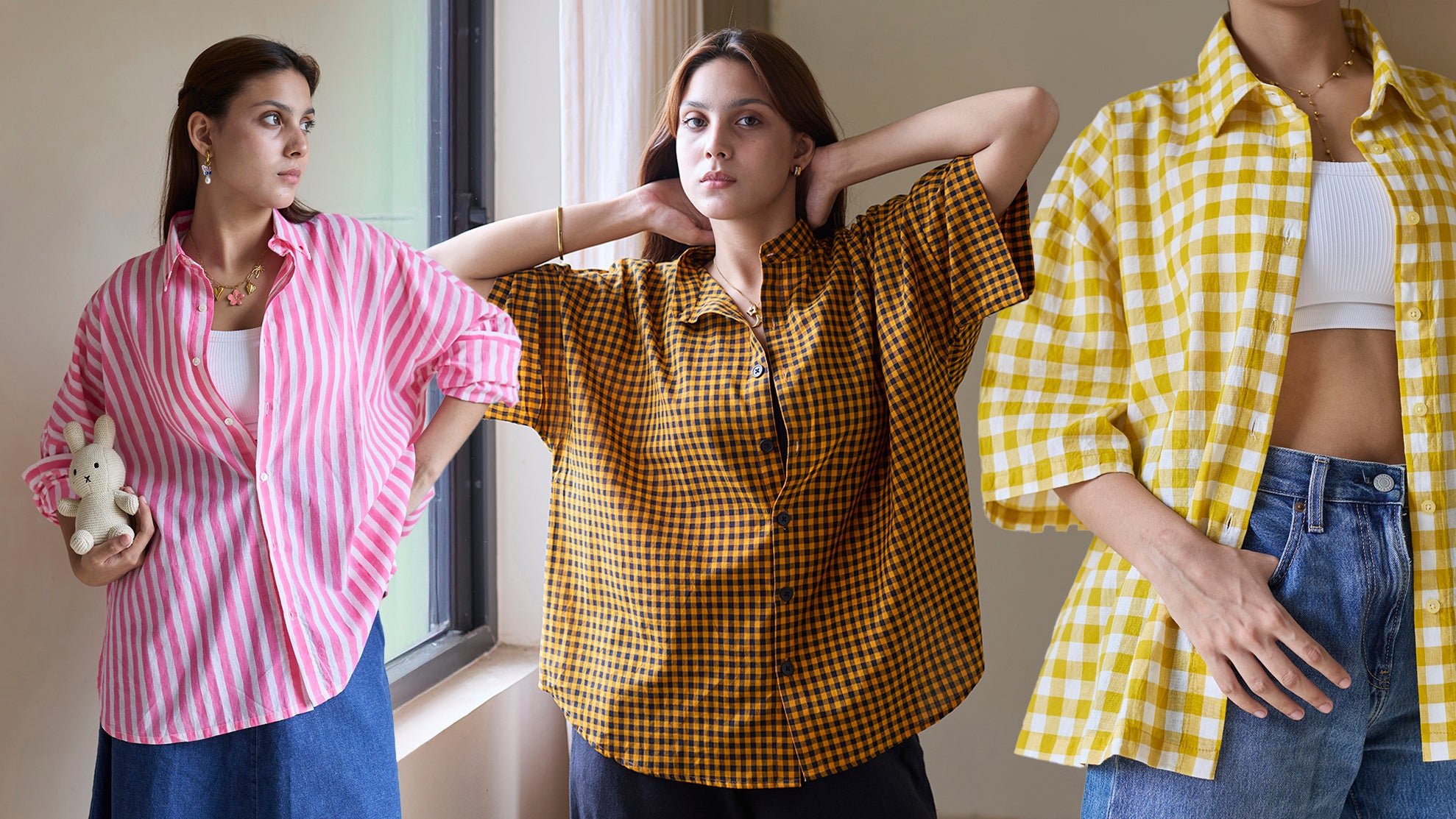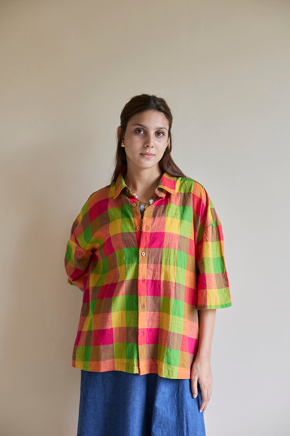 Crafted in 100% cotton, this oversized shirt features lively green, yellow, and pink checks, finished with natural coco buttons for a playful yet premium look.