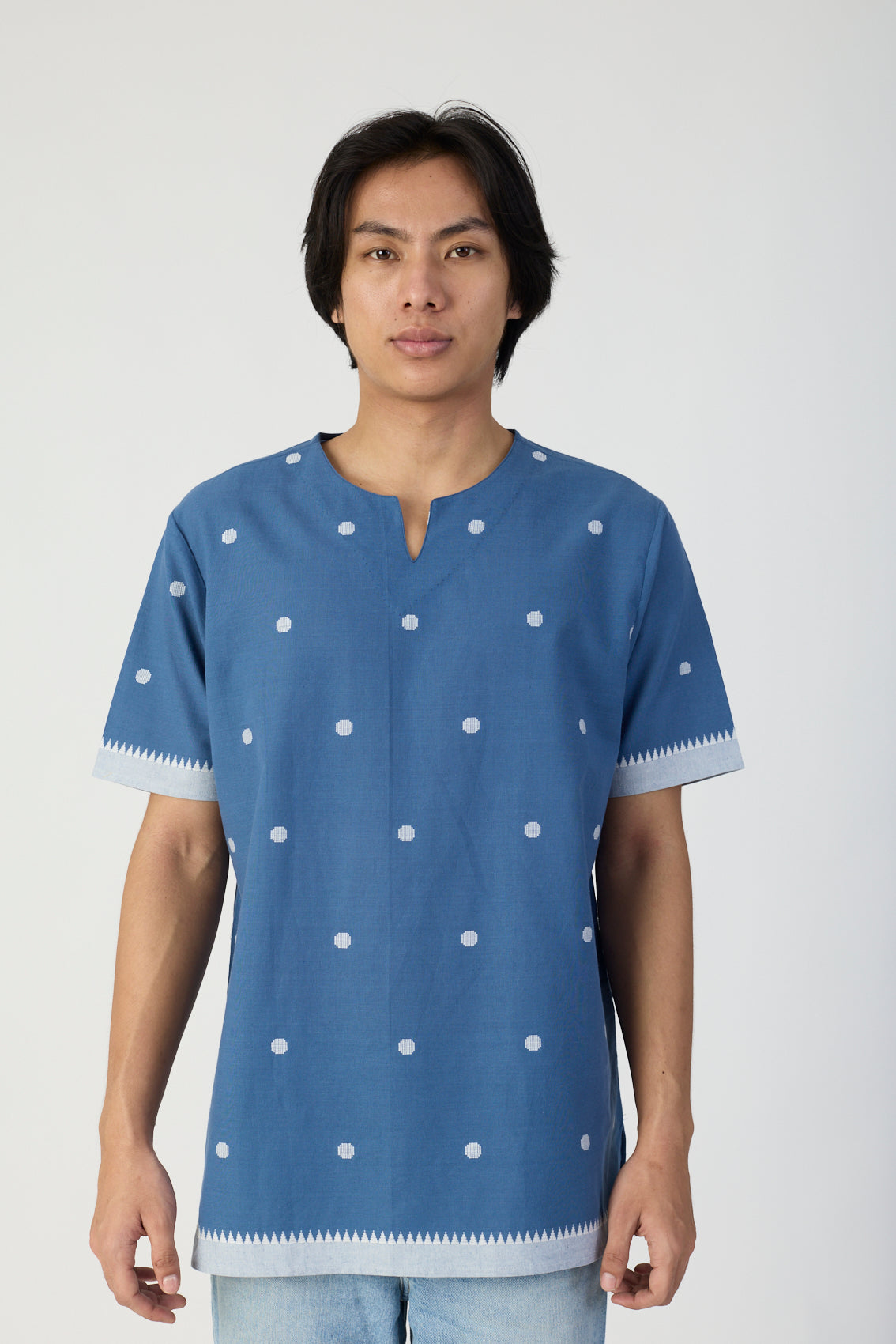 Dariya is a cotton short kurta for men, tailored in a relaxed fit for everyday ease with festive charm. The playful dot pattern with contrast edging adds a refreshing detail, making it a versatile piece for Diwali gatherings, casual festive evenings, or daily wear with a traditional twist. Pair it with jeans, trousers, or pajamas to style it your way.