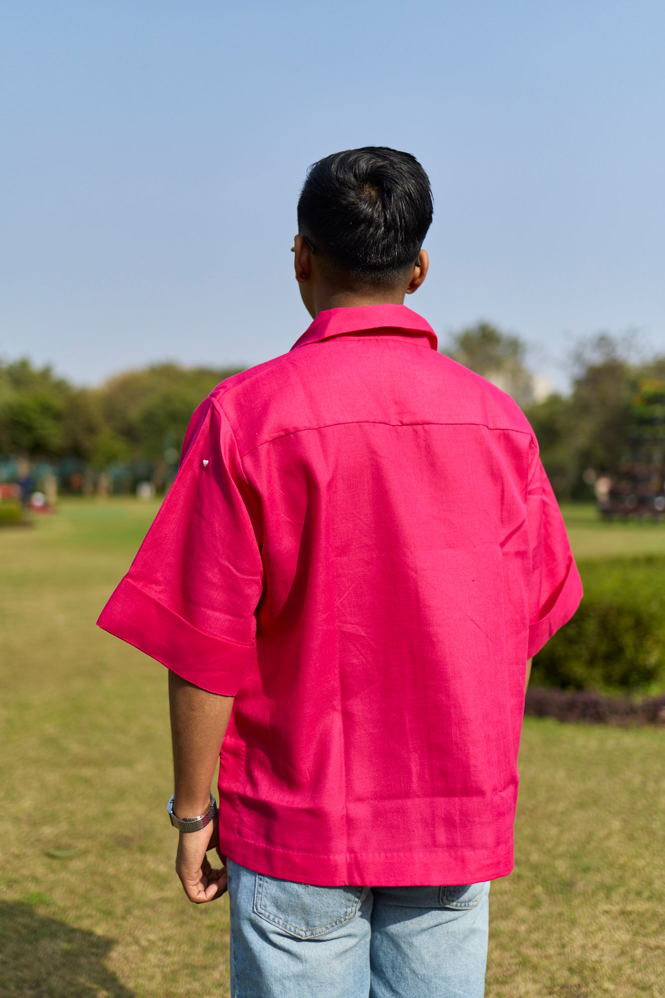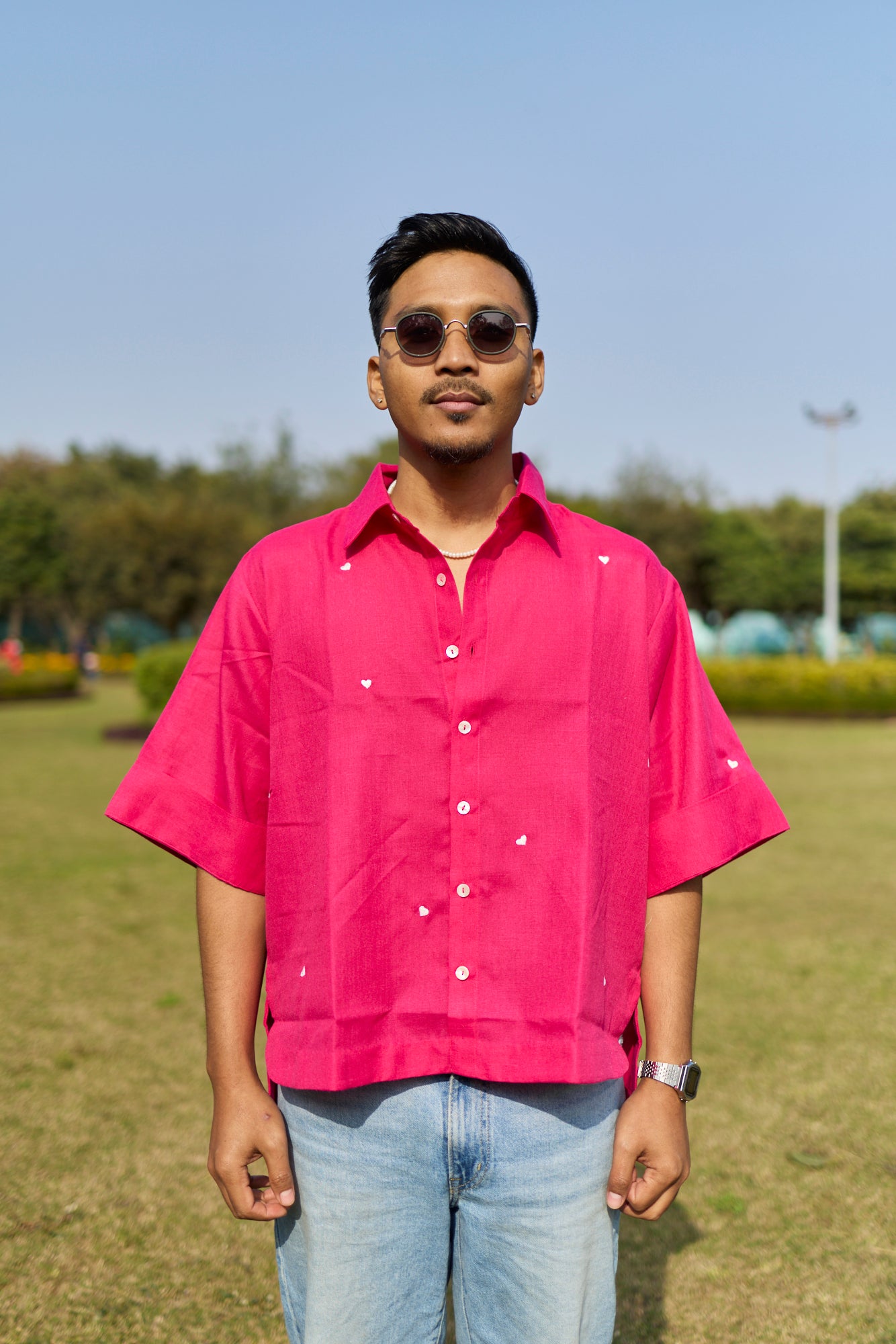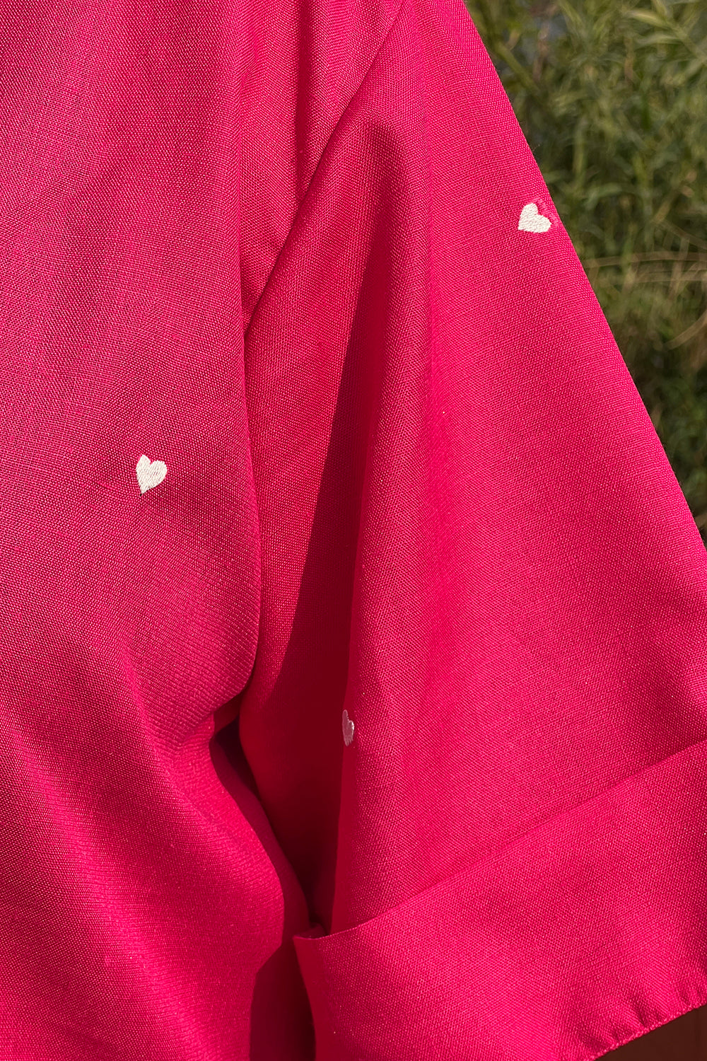 Crafted in a cotton linen blend, this bright pink shirt is scattered with tiny white heart motifs, expressing love in its most gentle form. Designed in a relaxed unisex fit, it offers effortless comfort with an easy, joyful feel.