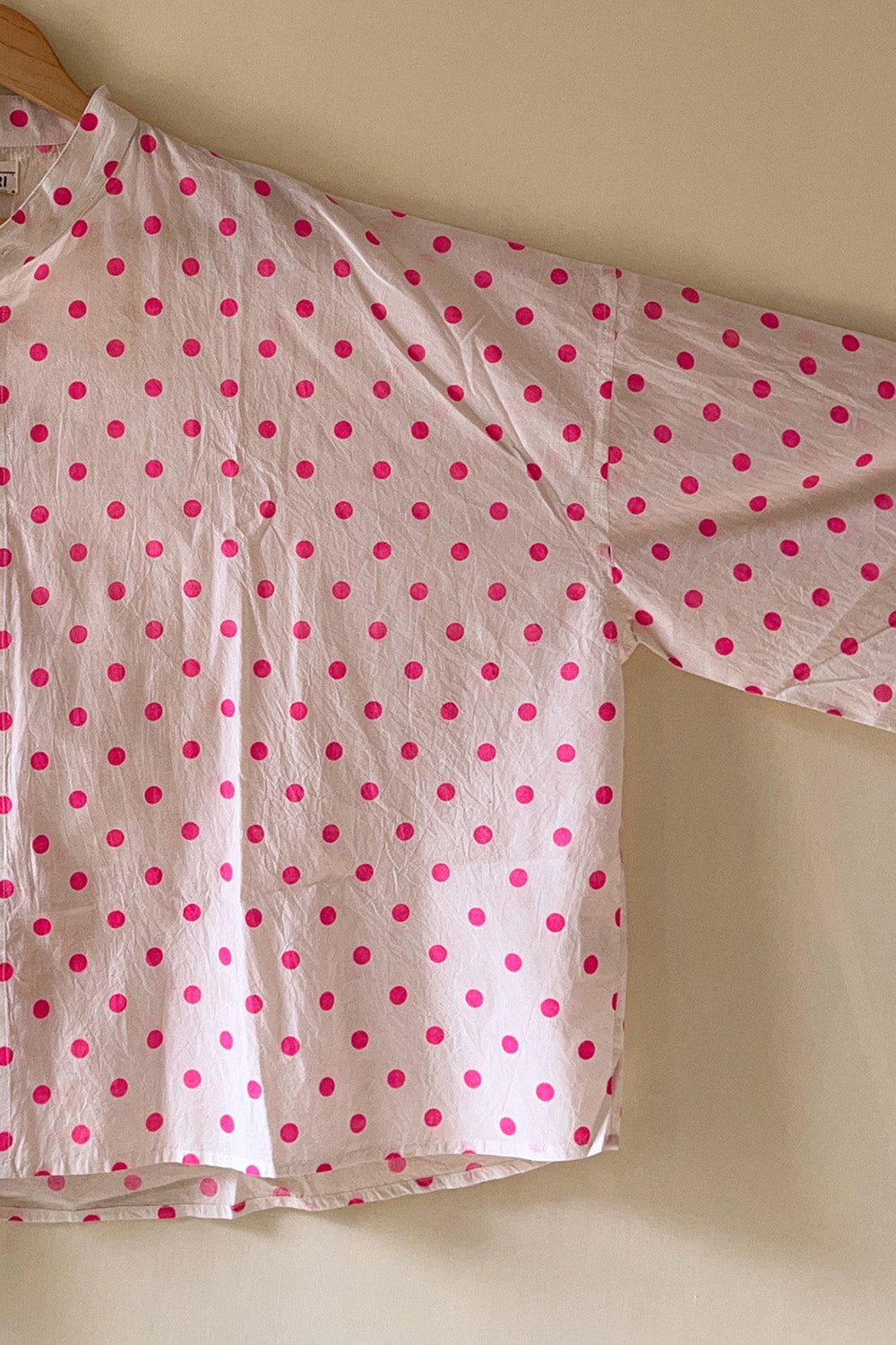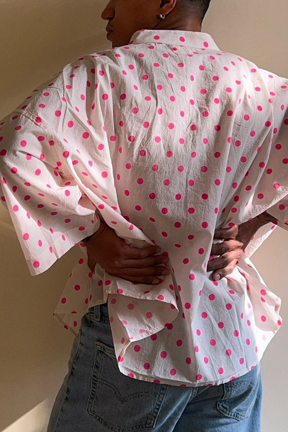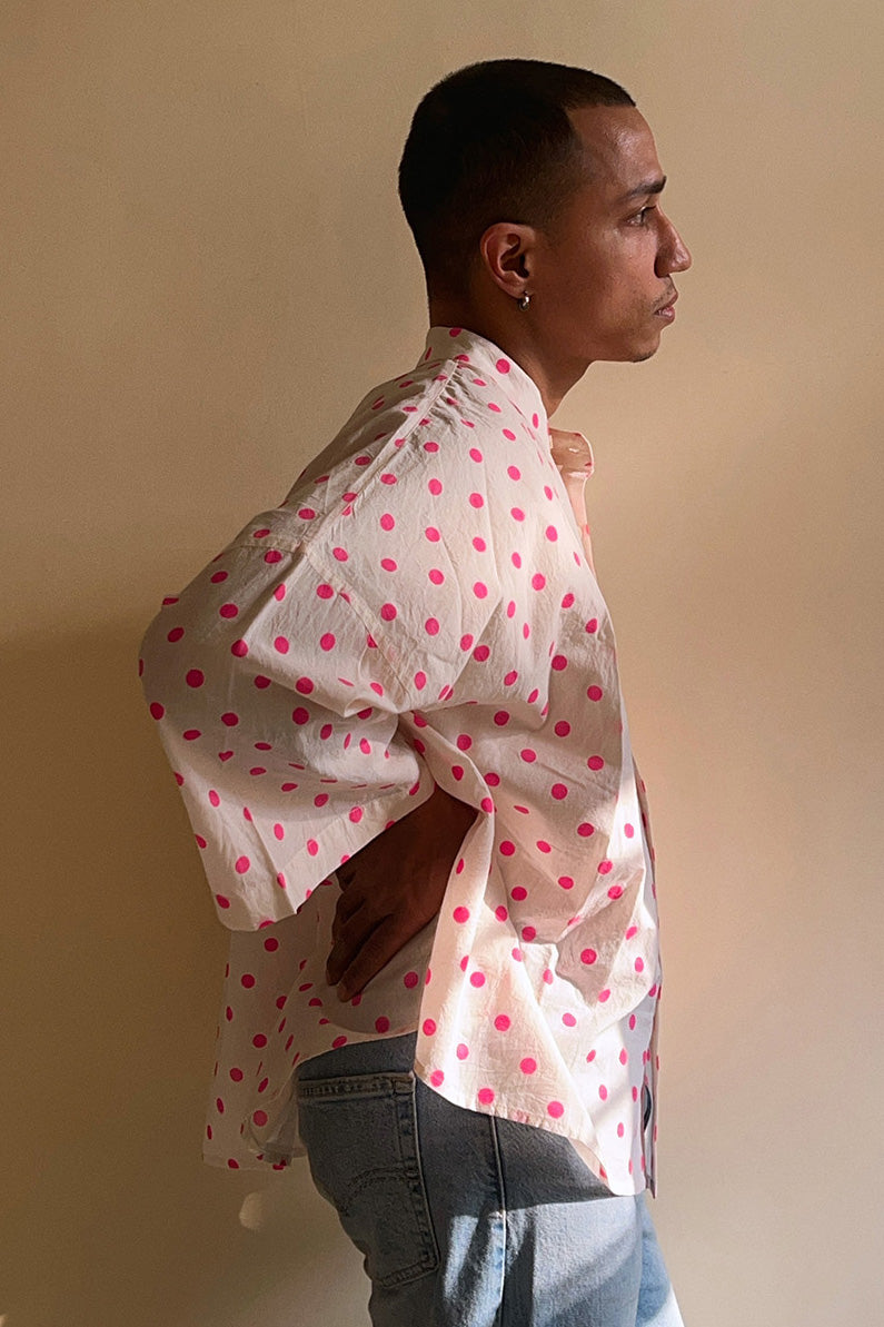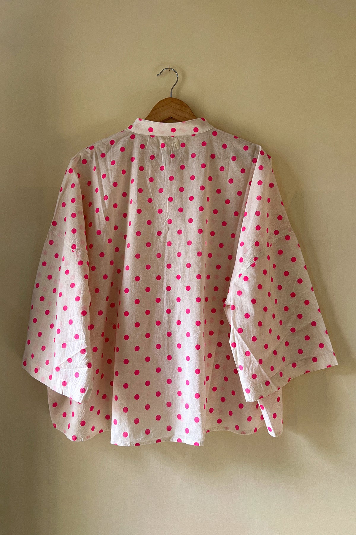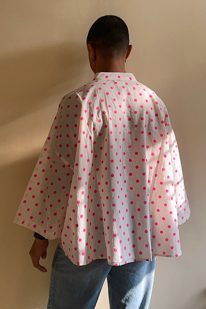 Crafted in soft cotton, this white oversized crop kimono shirt is sprinkled with bright pink polka dots and cut in a relaxed kimono-inspired silhouette - perfect to wear as a shirt or as a breezy layer on sun-kissed days.
