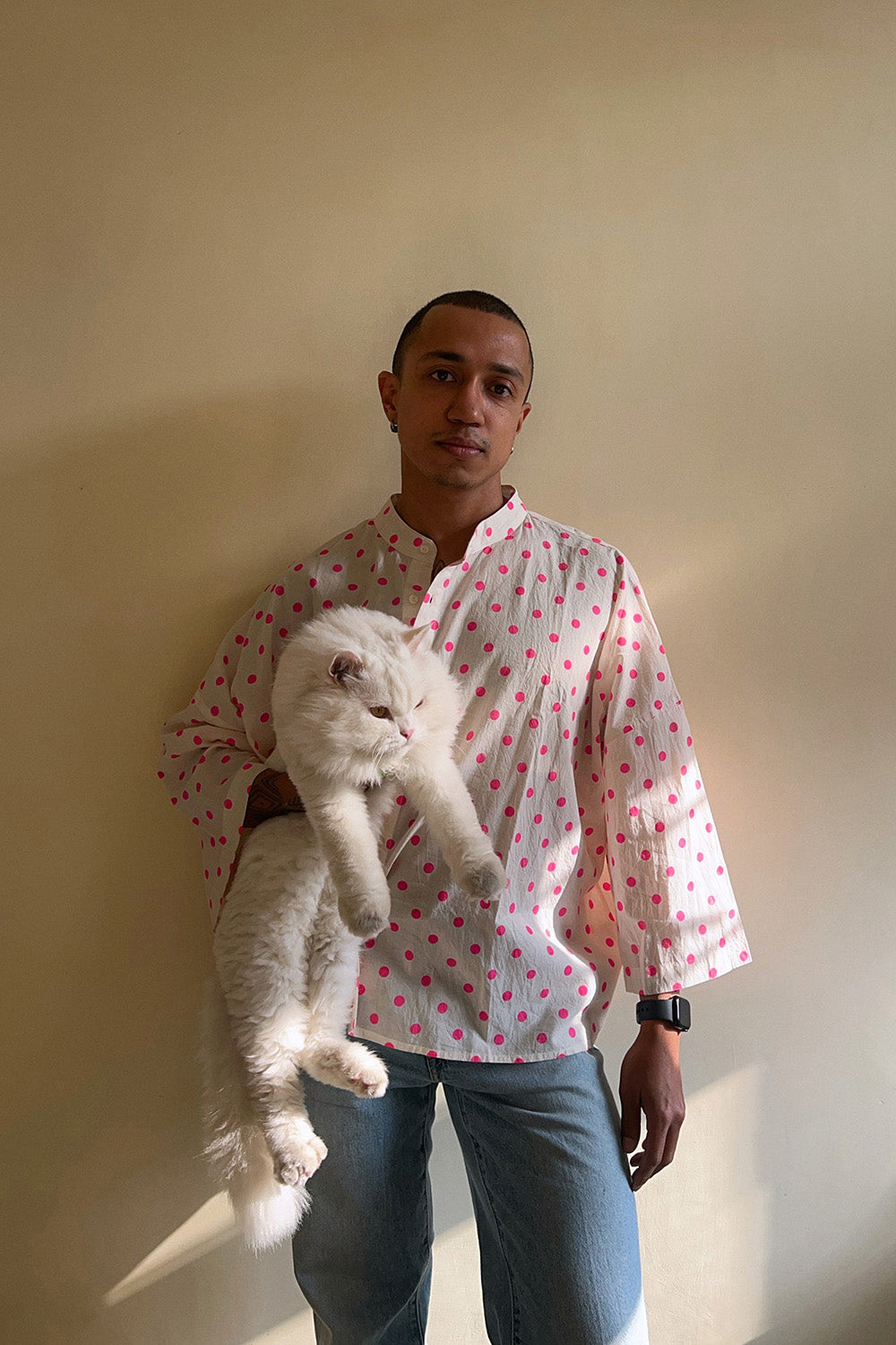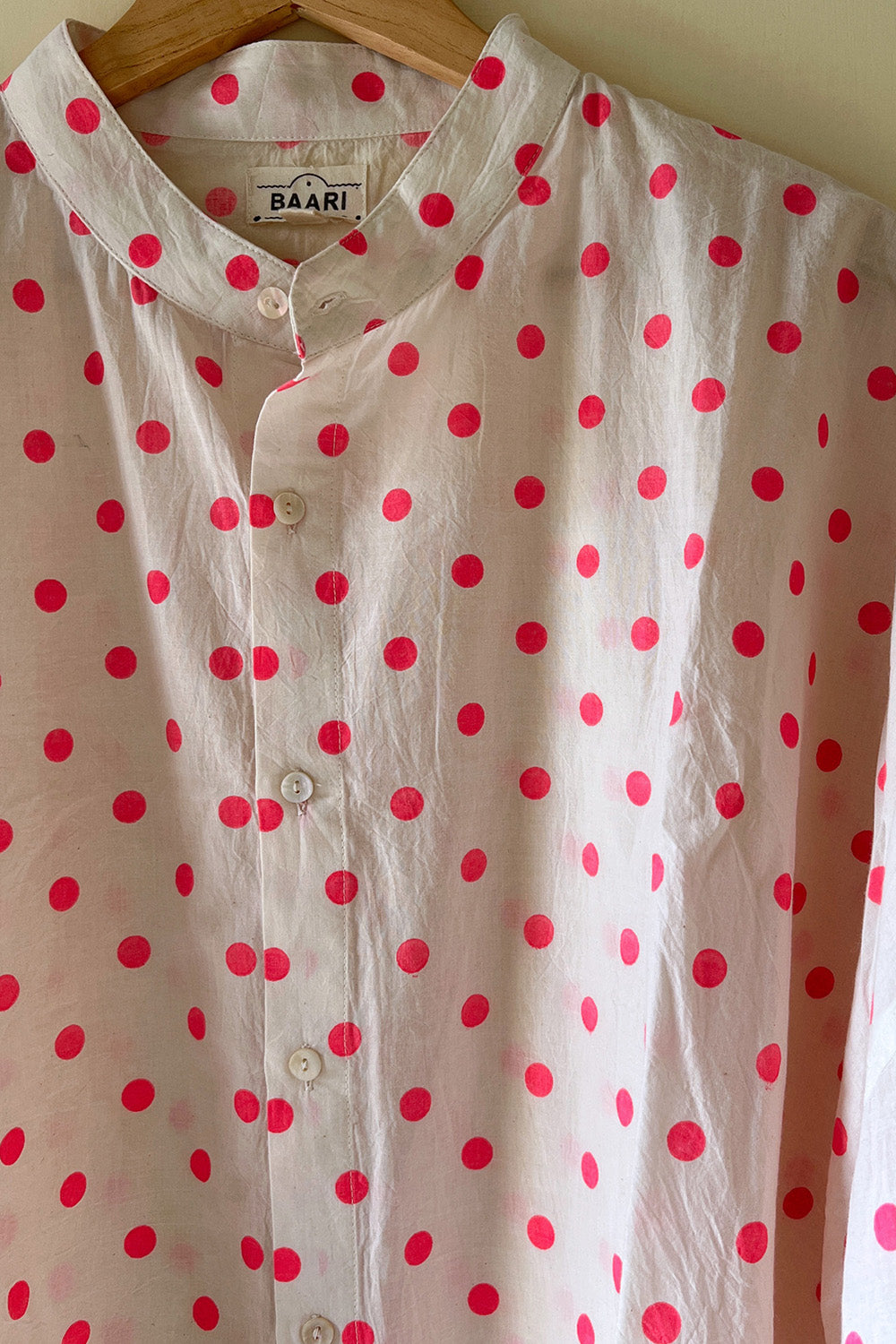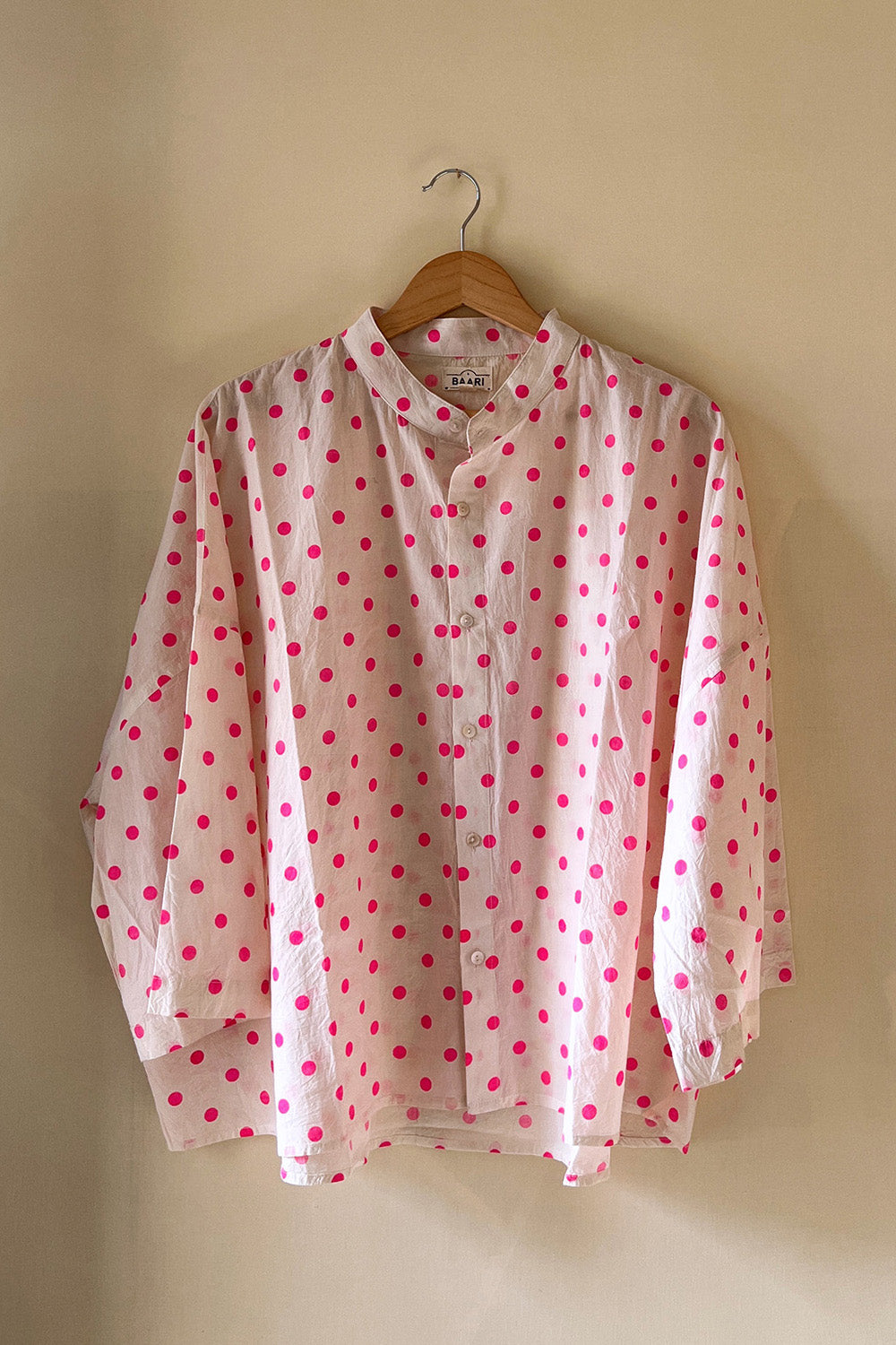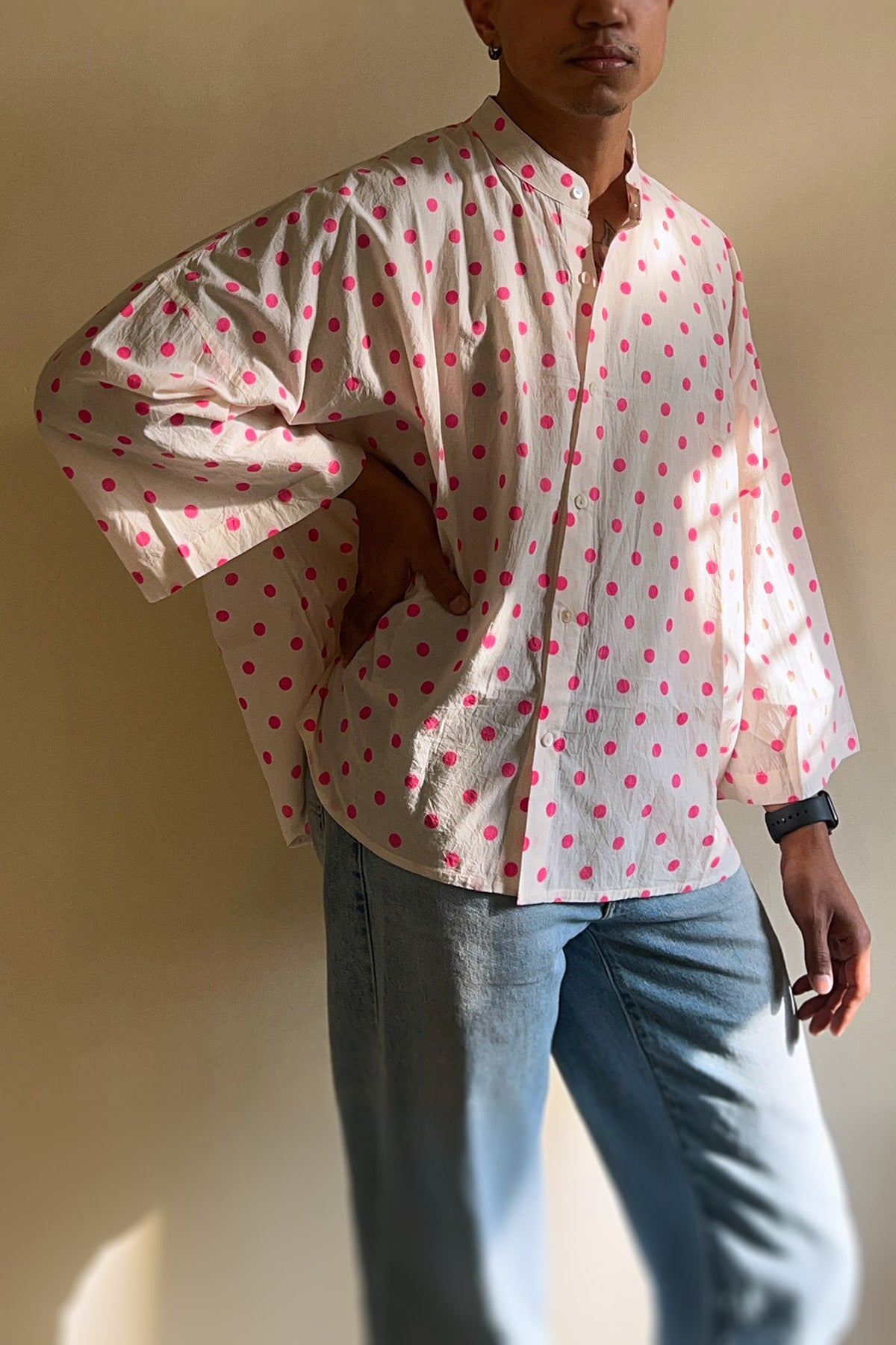 Crafted in soft cotton, this white oversized crop kimono shirt is sprinkled with bright pink polka dots and cut in a relaxed kimono-inspired silhouette - perfect to wear as a shirt or as a breezy layer on sun-kissed days.