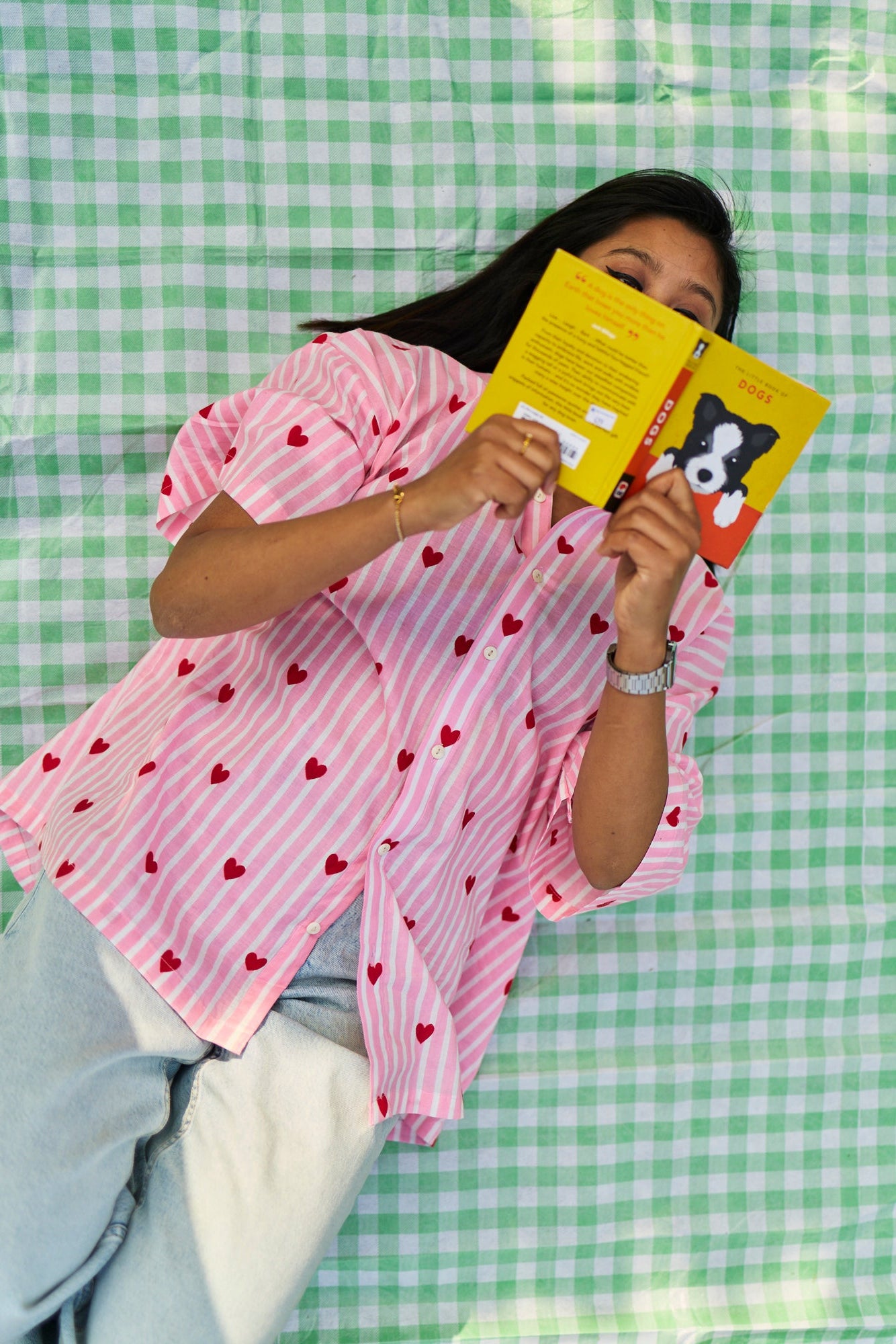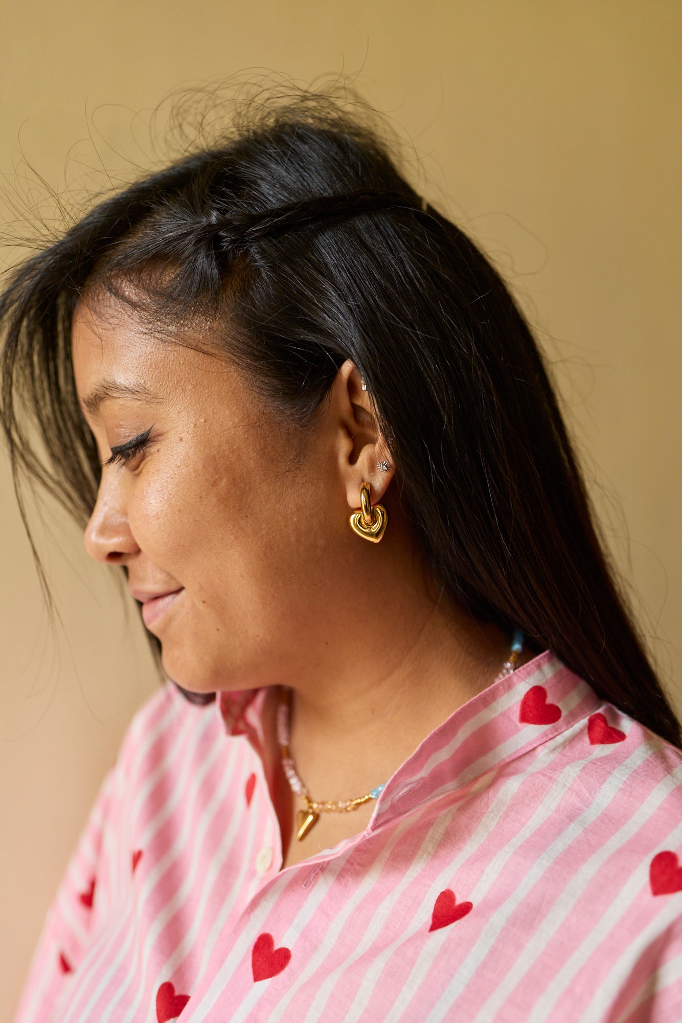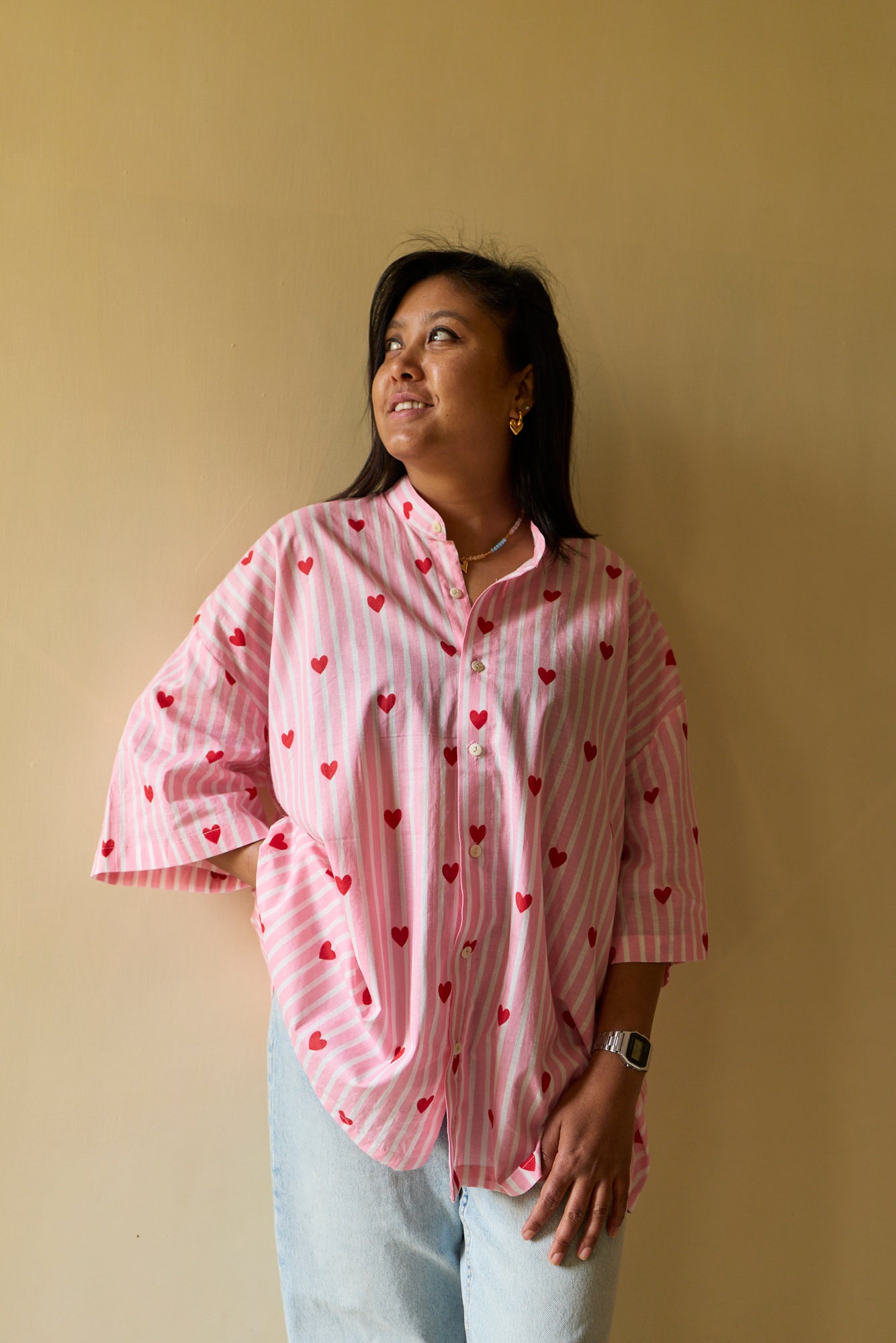 Crafted in 100% cotton, this oversized pink and white striped shirt is scattered with tiny red heart motifs, bringing together softness and joy. Designed in a relaxed unisex fit, it offers everyday comfort with a playful yet premium feel.