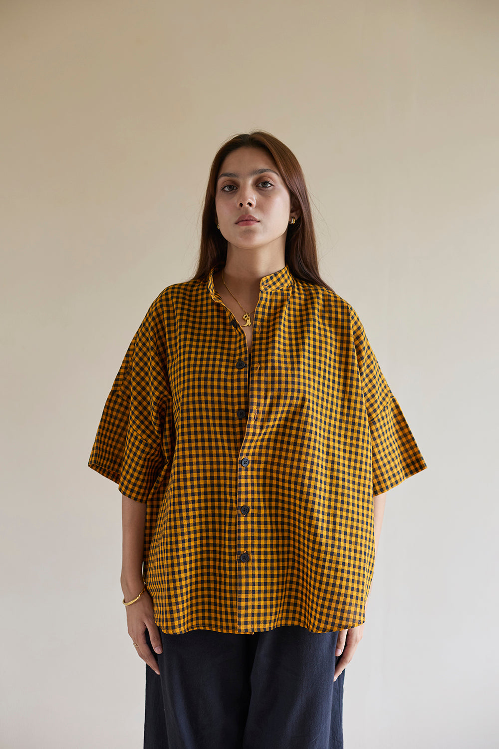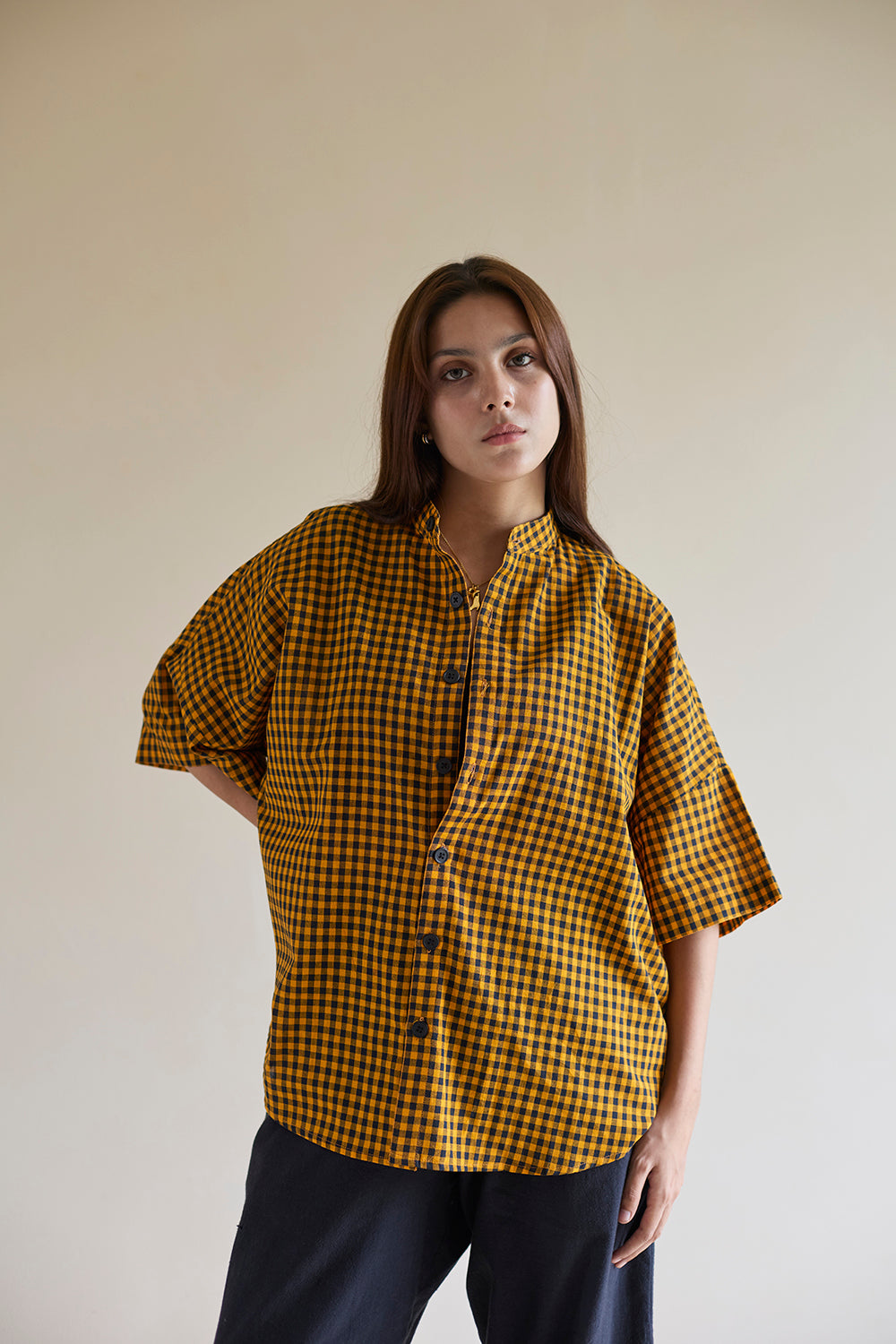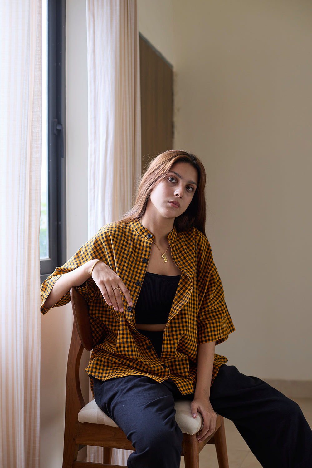 Made from 100% soft cotton, this mustard & black check oversized shirt features a Mandarin collar and bold black buttons.
