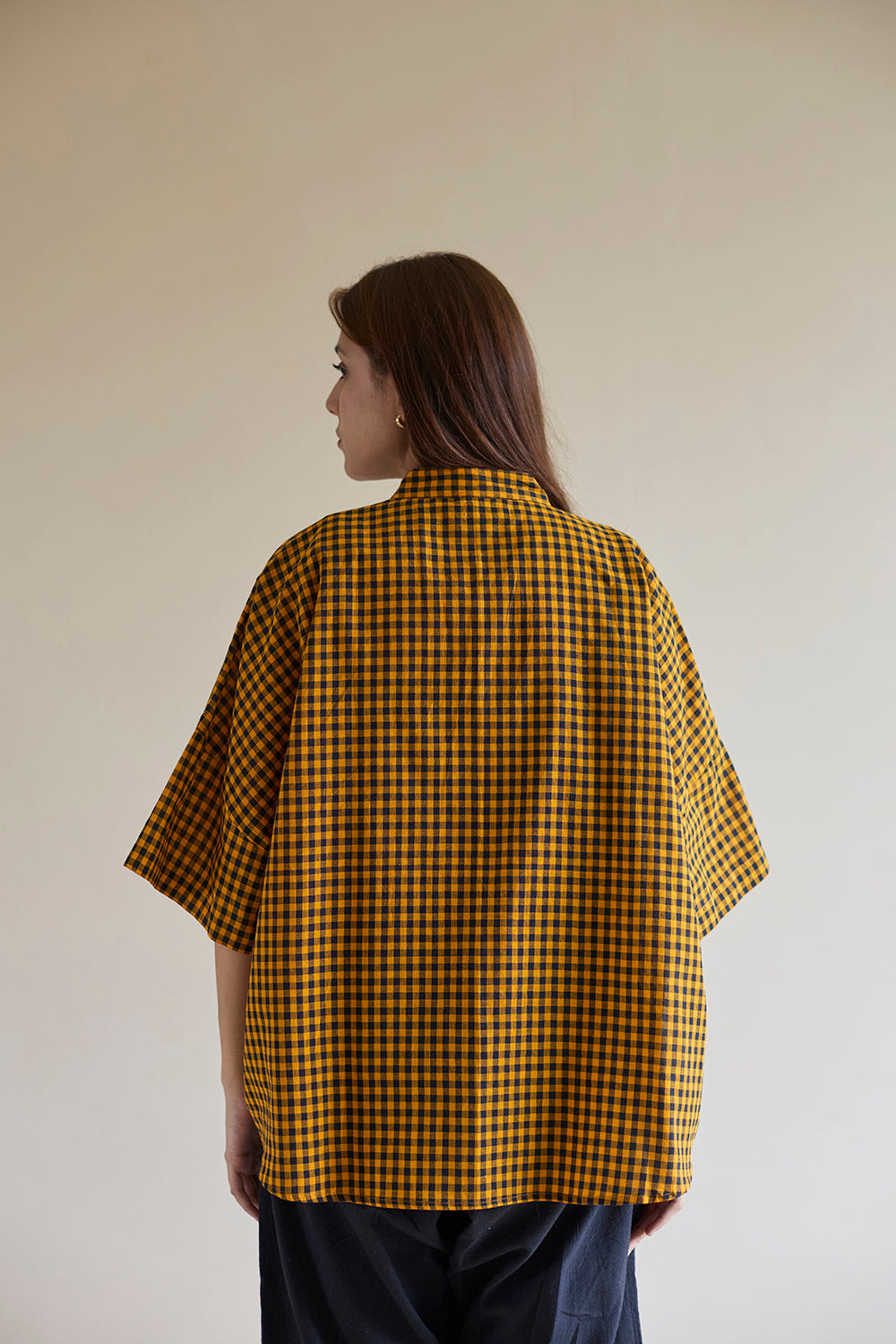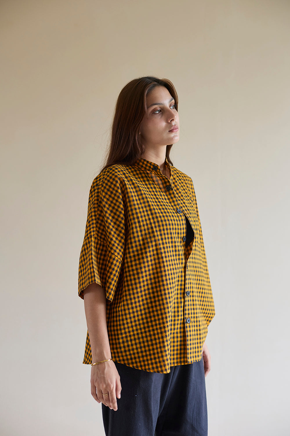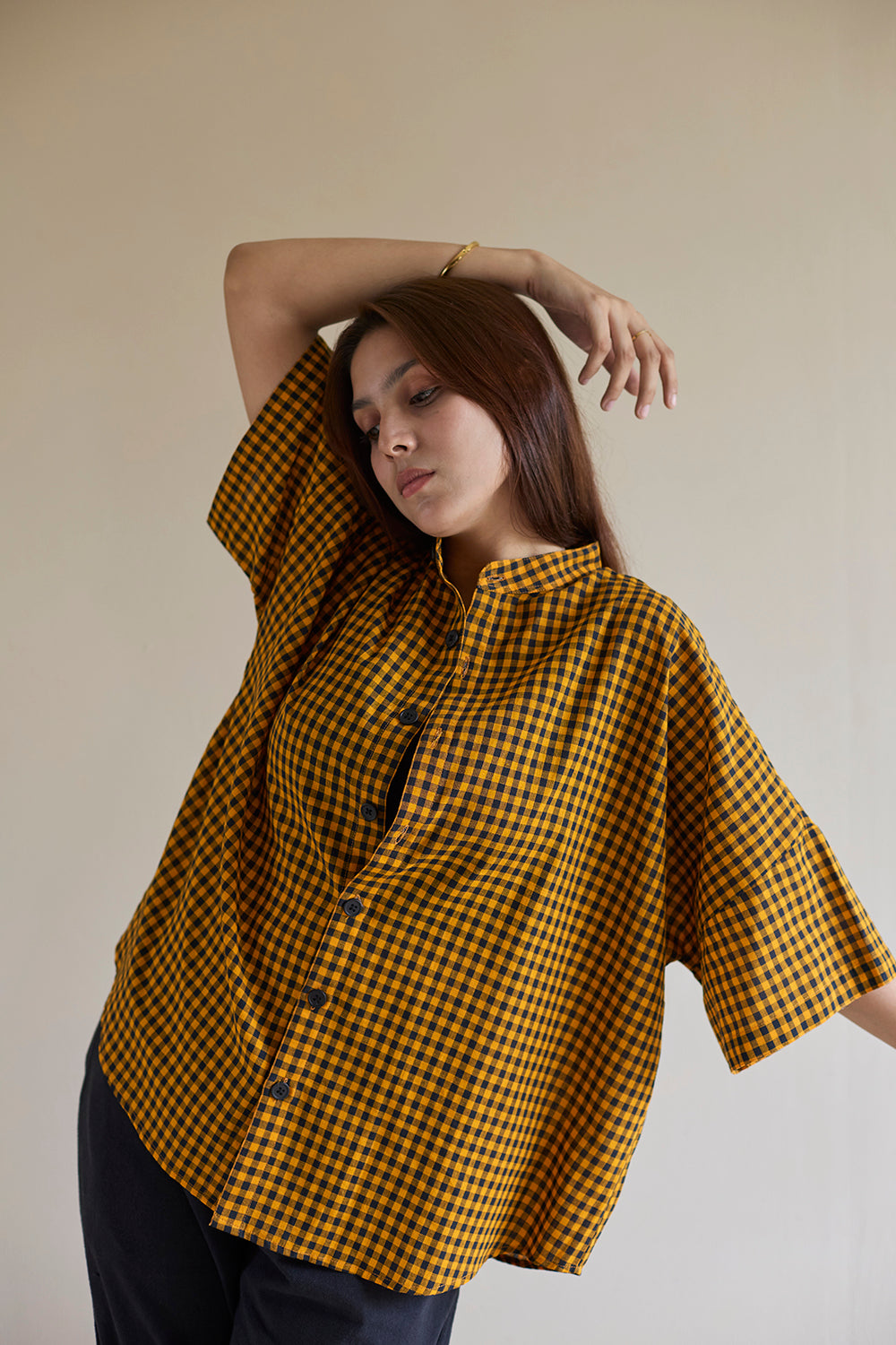 Made from 100% soft cotton, this mustard & black check oversized shirt features a Mandarin collar and bold black buttons.