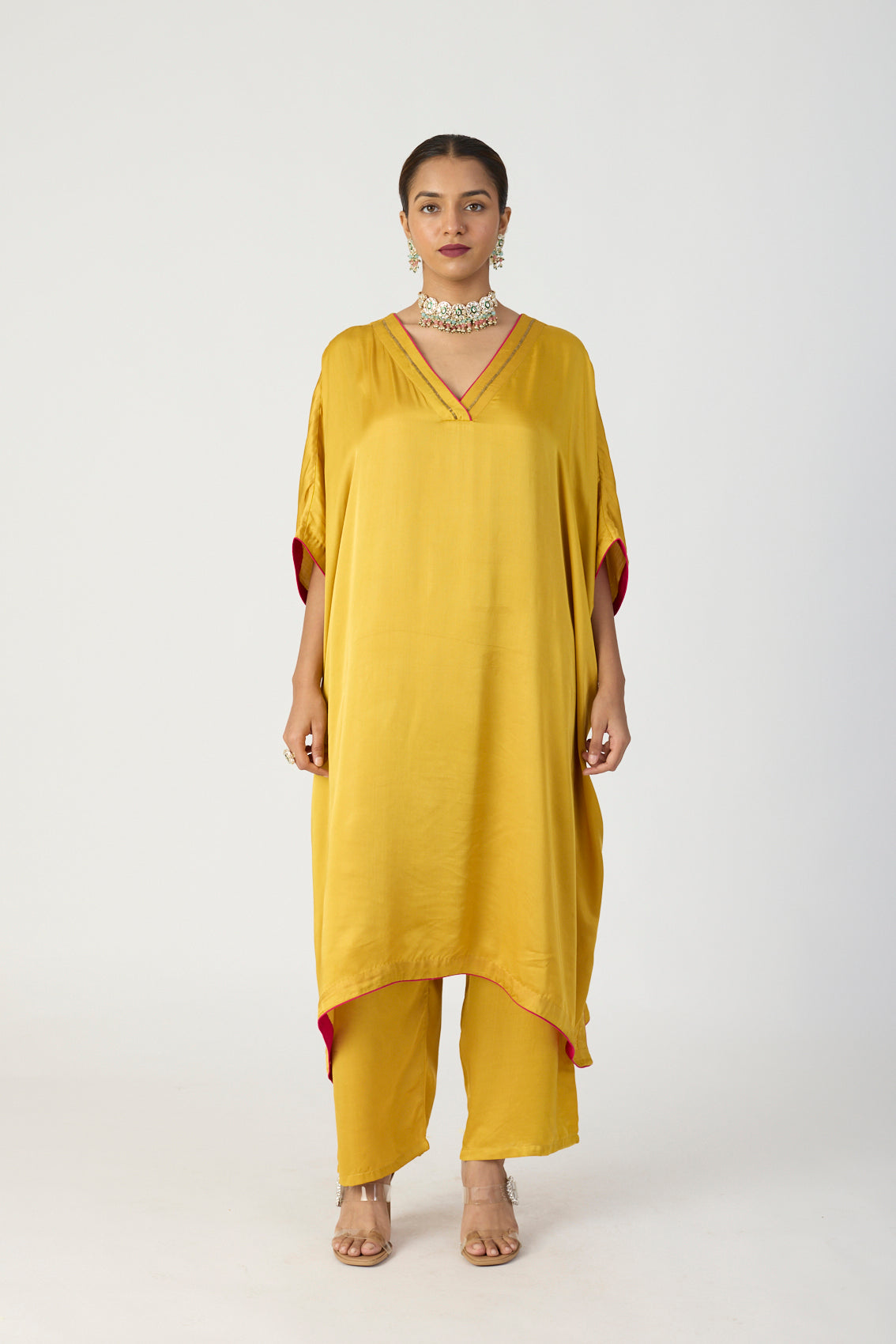 Sunehri is a festive satin kaftan set for women, crafted in a free-flowing silhouette that blends comfort with effortless elegance. Designed with a flattering V-neckline, highlighted by delicate pink piping and sequin detailing, this kaftan brings a subtle festive sparkle. A dori at the back allows you to adjust the fit as per your size, while the set comes complete with coordinated satin pants, making it the perfect choice for a Diwali outfit, wedding celebration, or festive gathering.